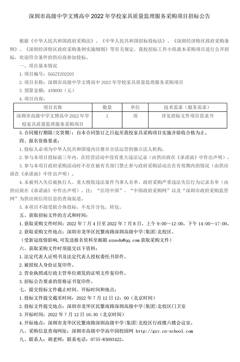 深圳市高级中学文博高中2022年学校家具质量监理服务采购项目招标公告