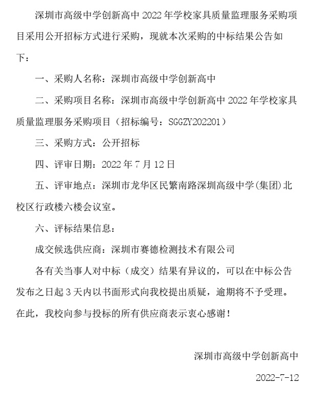 深圳市高级中学创新高中2022年学校家具质量监理服务采购项目中标公示