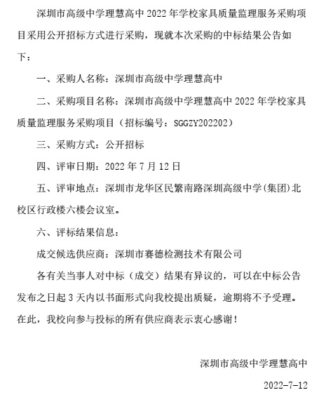 深圳市高级中学理慧高中2022年学校家具质量监理服务采购项目中标公示