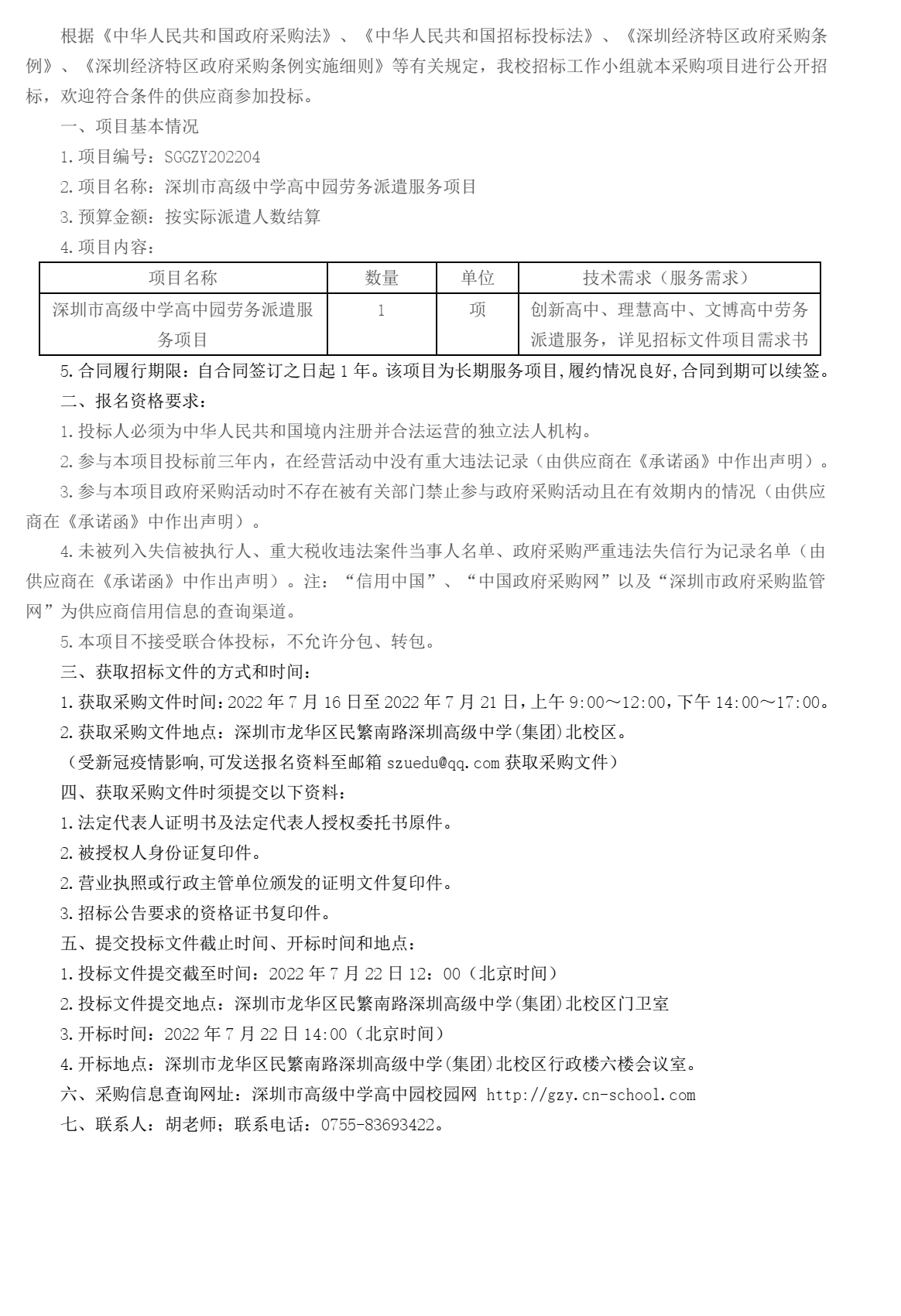 深圳市高级中学高中园劳务派遣服务项目招标公告