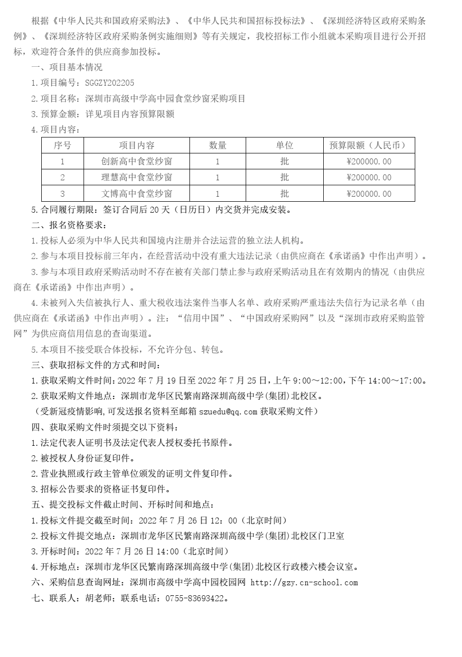 深圳市高级中学高中园食堂纱窗采购项目招标公告