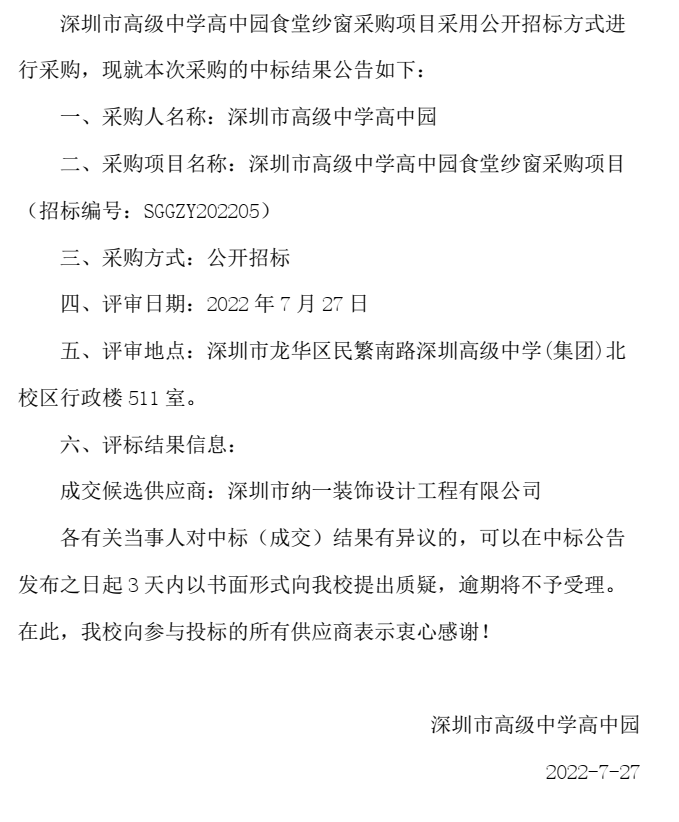深圳市高级中学高中园食堂纱窗采购项目中标公示