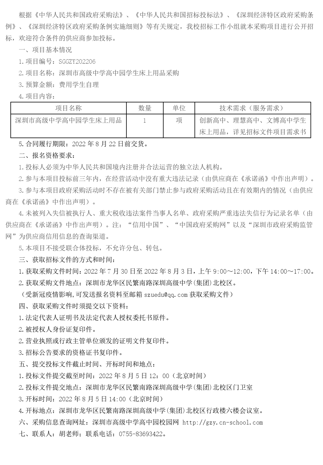 深圳市高级中学高中园学生床上用品采购项目招标公告