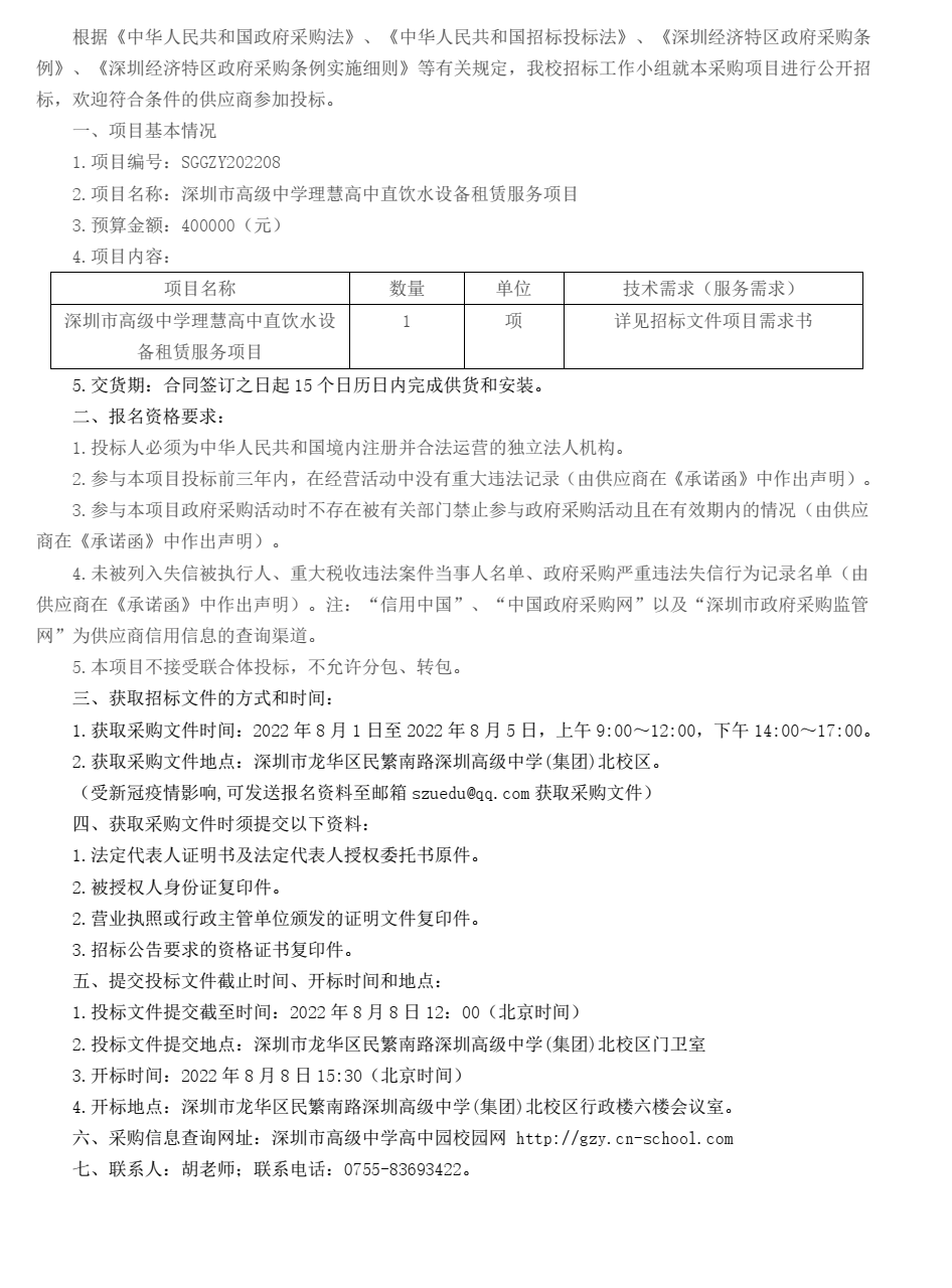 深圳市高级中学理慧高中直饮水设备租赁服务项目招标公告