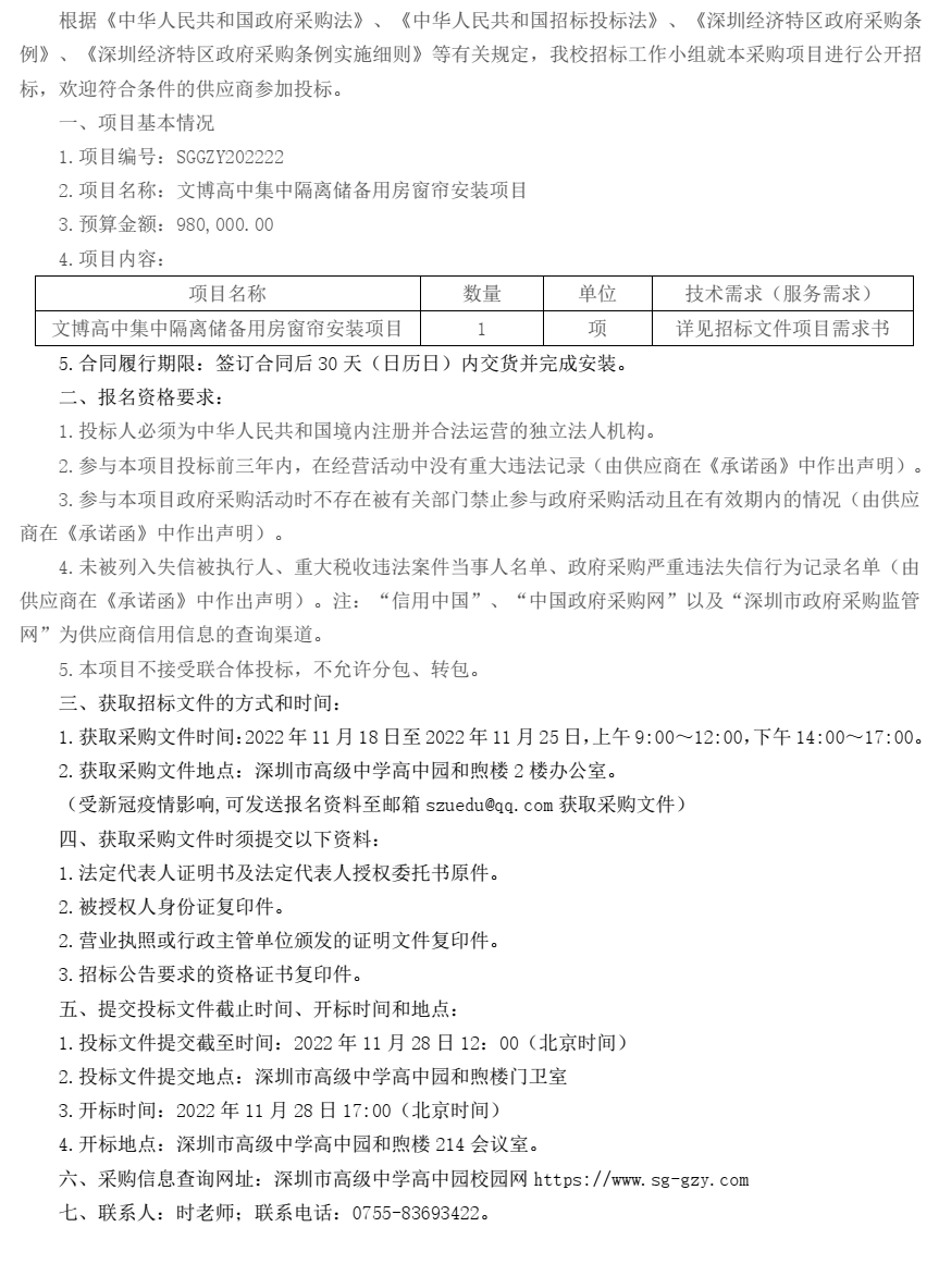 文博高中集中隔离储备用房窗帘安装项目招标公告
