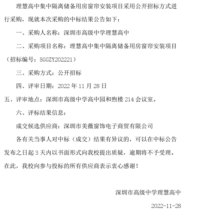 理慧高中集中隔离储备用房窗帘安装项目中标公示