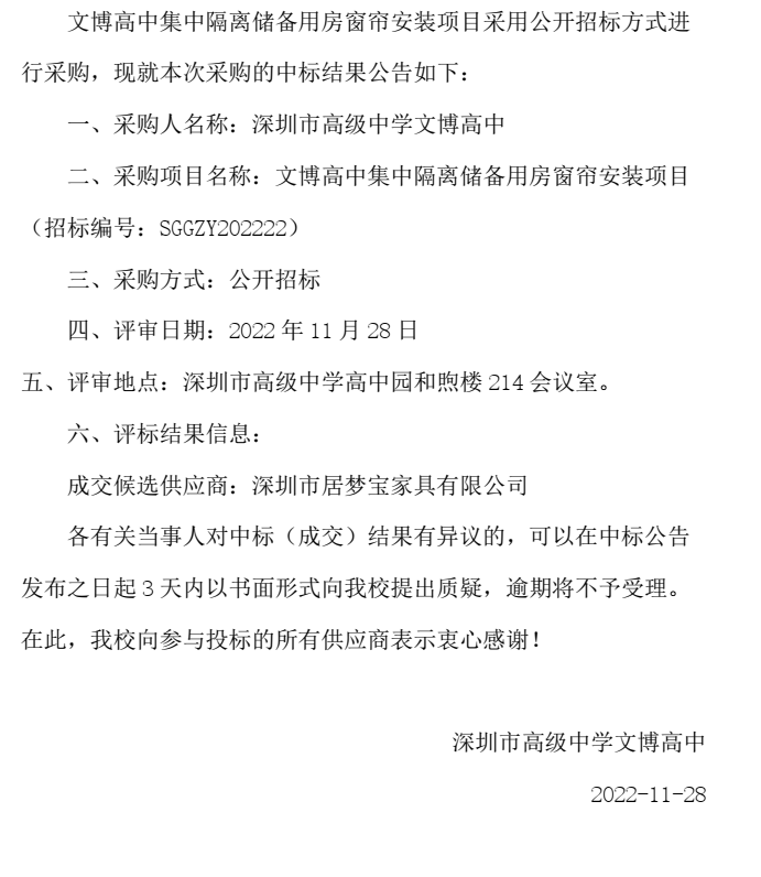 文博高中集中隔离储备用房窗帘安装项目中标公示