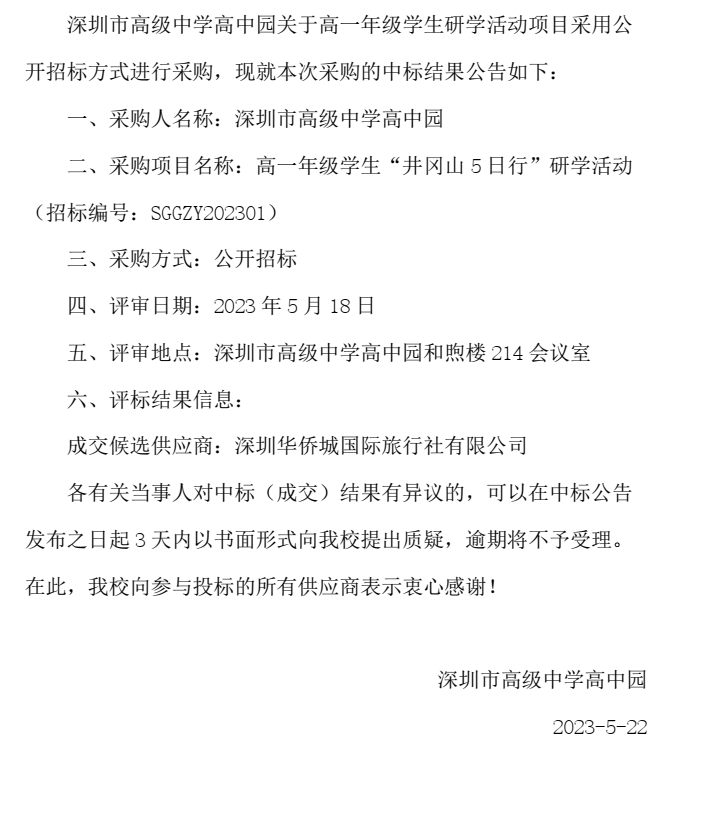 深圳市高级中学高中园关于高一年级学生研学活动中标公示