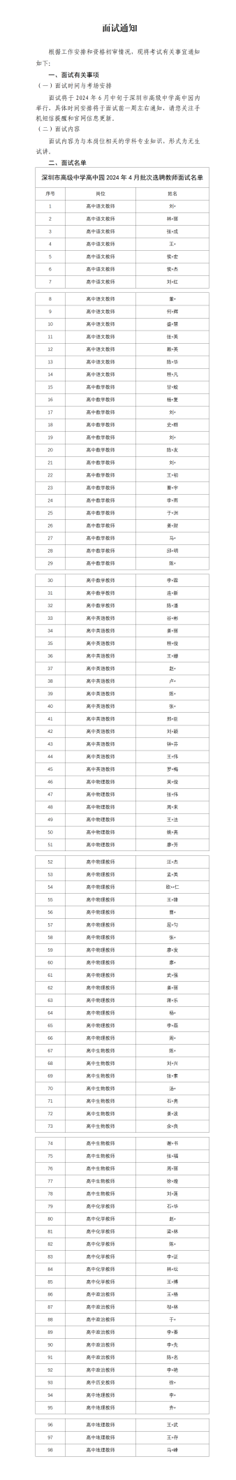 深圳市高级中学高中园2024年4月面向社会 公开选聘教师公告