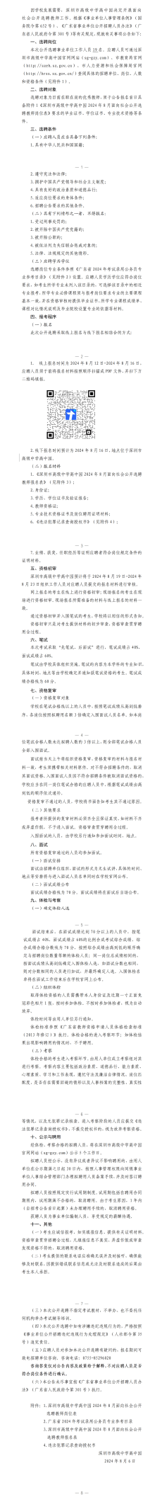 深圳市高级中学高中园2024年8月面向社会 公开选聘教师公告