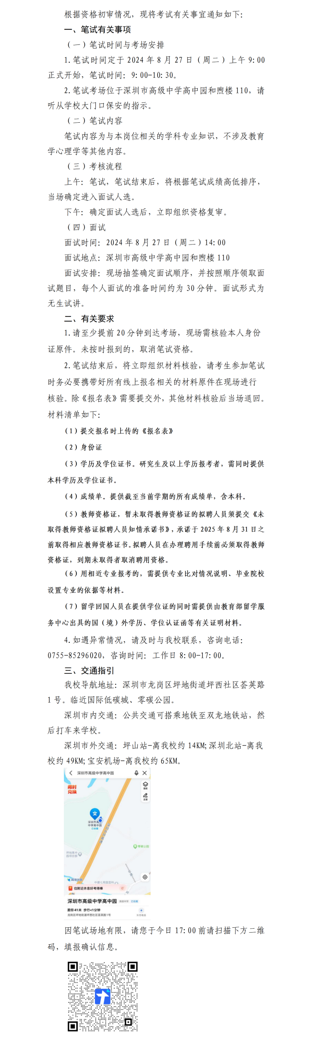 深圳市高级中学高中园 2024年8月校招 综合成绩及入围体检名单的公告