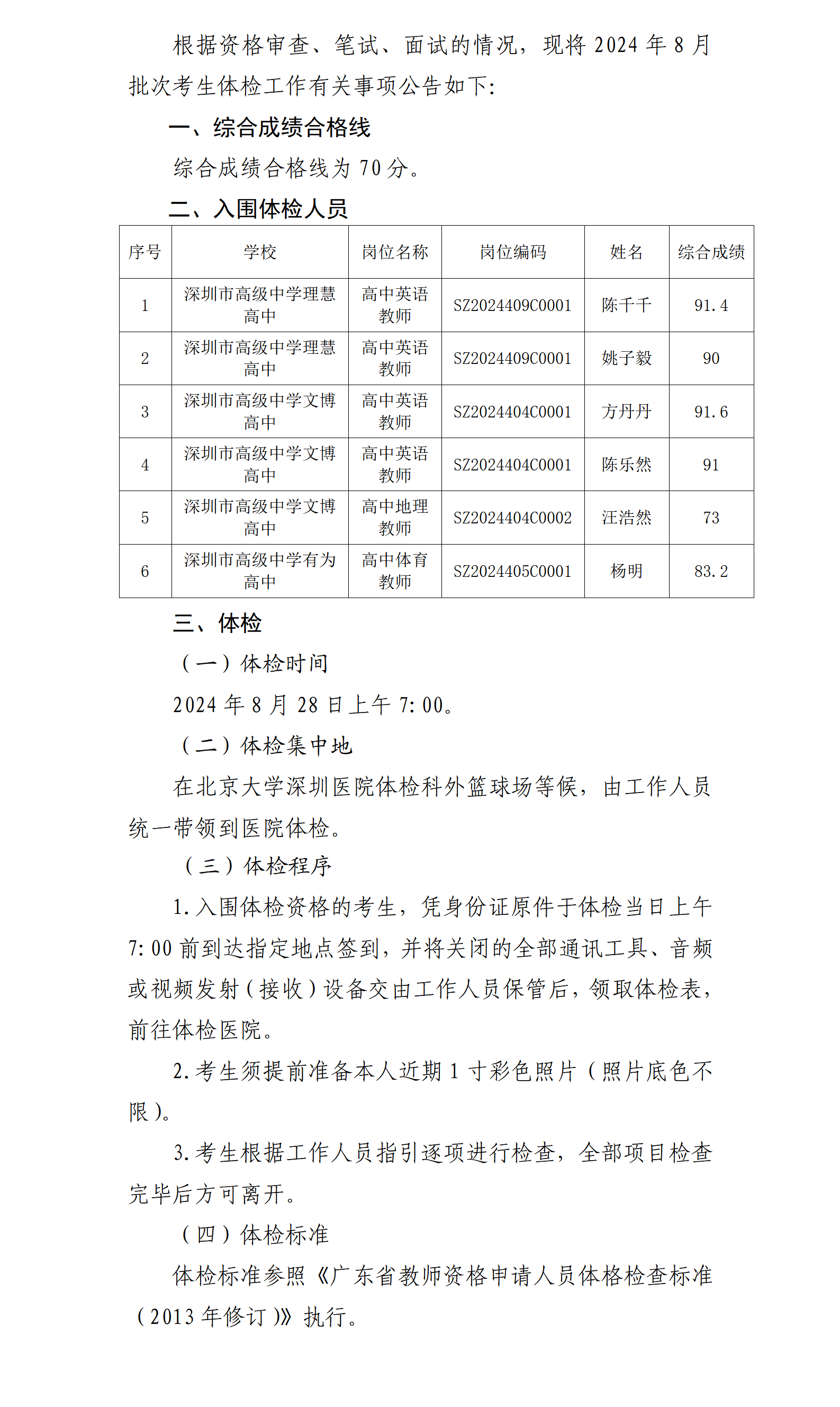 深圳市高级中学高中园 2024年8月校招 综合成绩及入围体检名单的公告