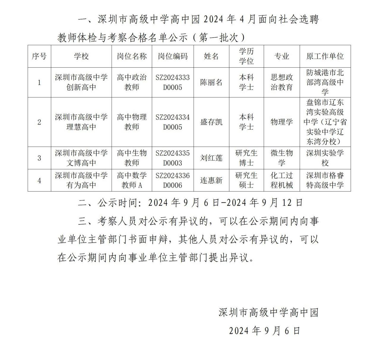 深圳市高级中学高中园 2024年4月选聘教师 体检与考察合格名单公示(第一批次)