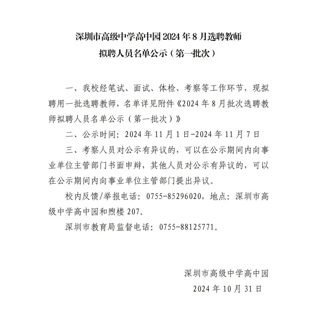 深圳市高级中学高中园 2024年4月选聘教师 拟聘人员名单公示(第三批次)
