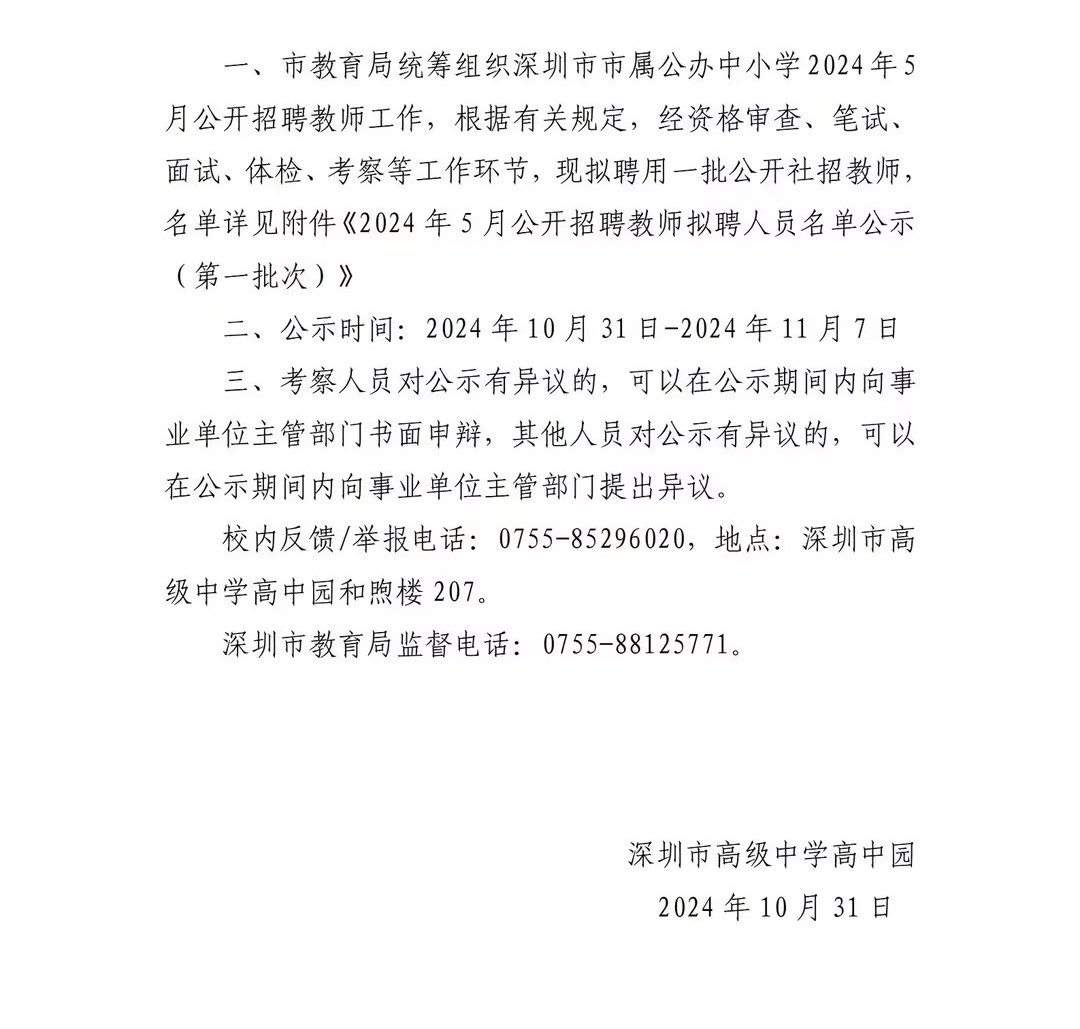 深圳市高级中学高中园2024年5月公开招聘教师 拟聘人员名单公示(第一批次)