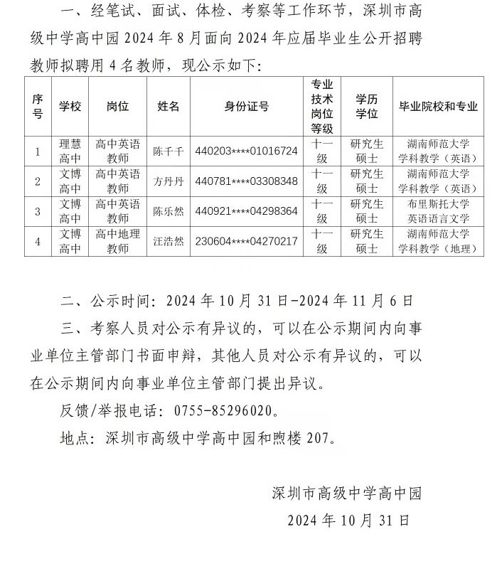 深圳市高级中学高中园2024年8月面向2024年应届毕业生公开招聘教师拟聘人员名单公示