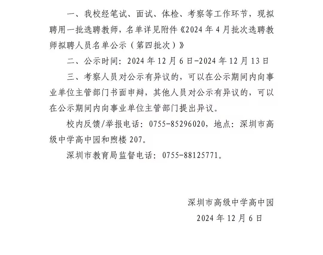 深圳市高级中学高中园 2024年4月选聘教师 拟聘人员名单公示(第四批次)