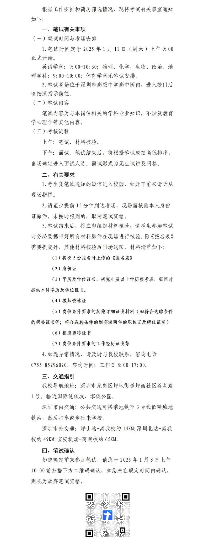 深圳市高级中学高中园2025年1月面向社会 公开选聘教师公告