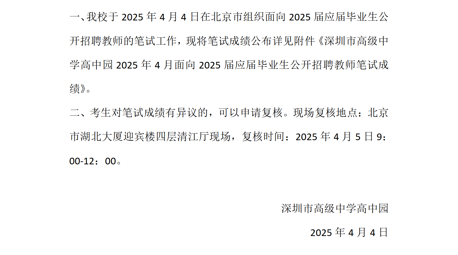 深圳市高级中学高中园 2025 年3月面向 2025 届应届毕业生公开招聘教师笔试成绩公布