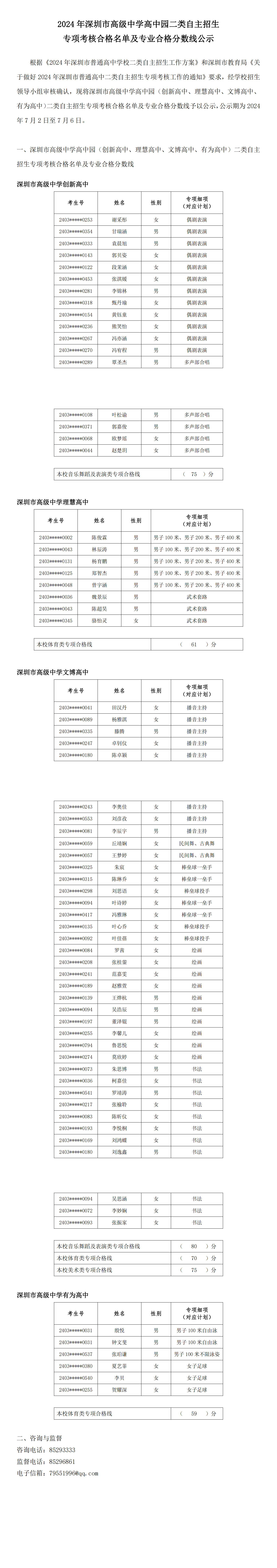 2024年深圳市高级中学高中园二类自主招生专项考核合格名单及专业合格分数线公示