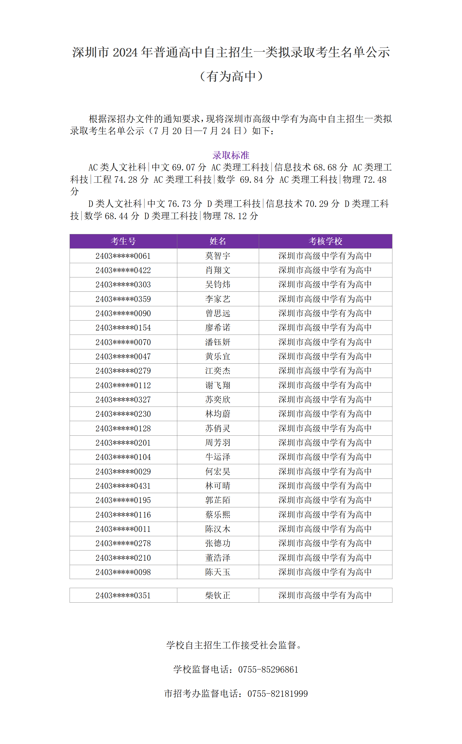 深圳市2024年普通高中自主招生一类拟录取考生名单公示(有为高中)