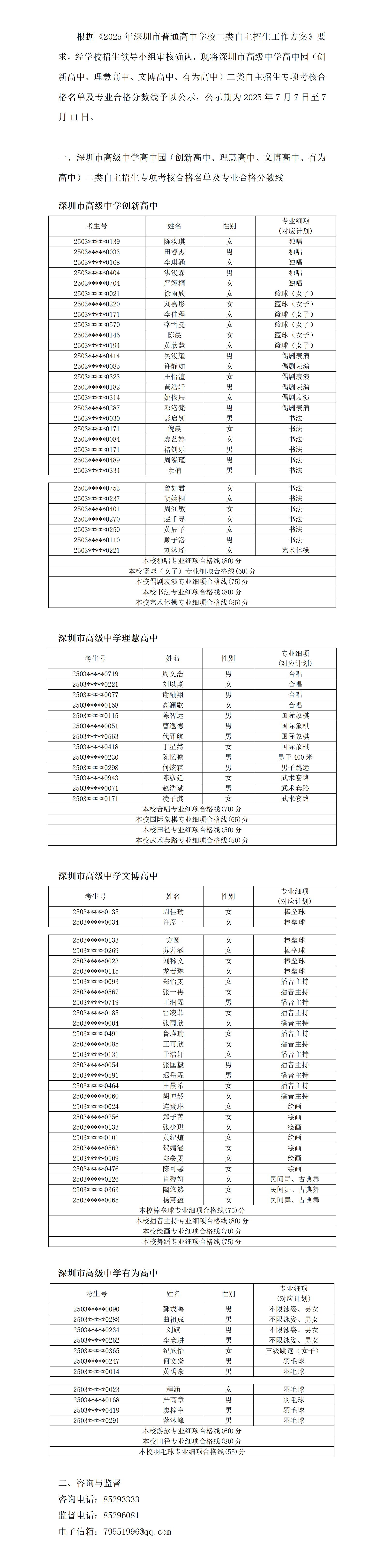 2025年深圳市高级中学高中园二类自主招生专项考核合格名单及专业合格分数线公示