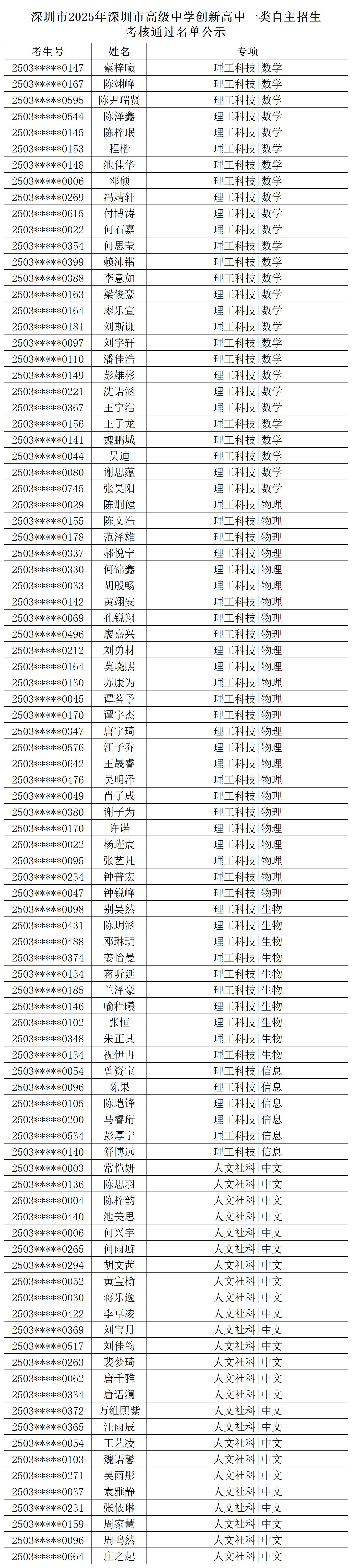 深圳市2025年深圳市高级中学高中园一类自主招生考核通过名单公示