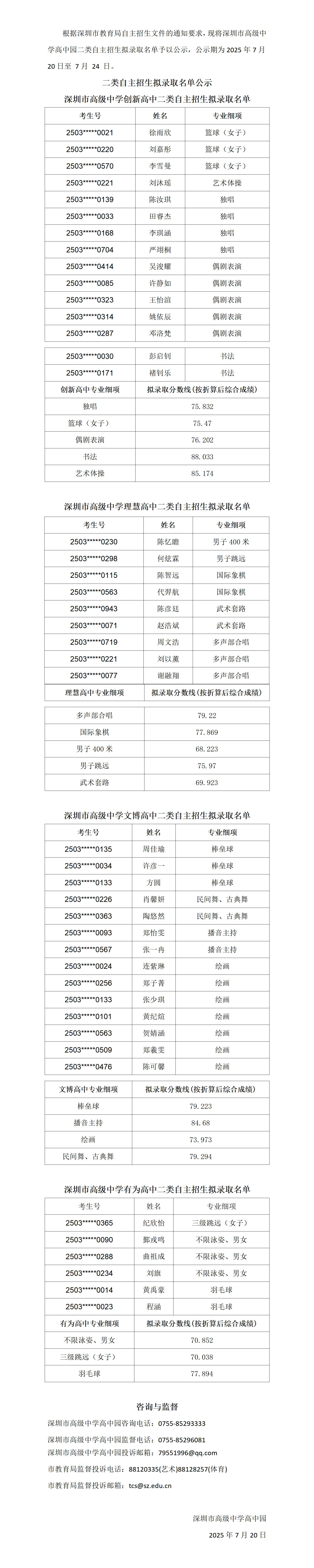 深圳市2025年深圳市高级中学高中园 二类自主招生拟录取名单公示