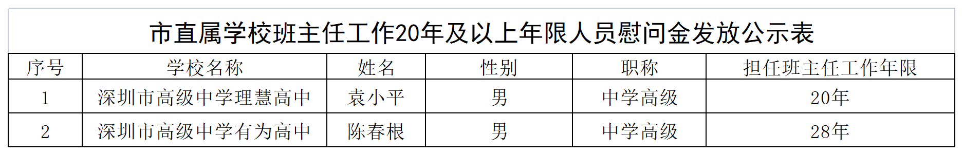 深圳市高级中学高中园班主任工作20年及以上年限人员慰问金发放公示
